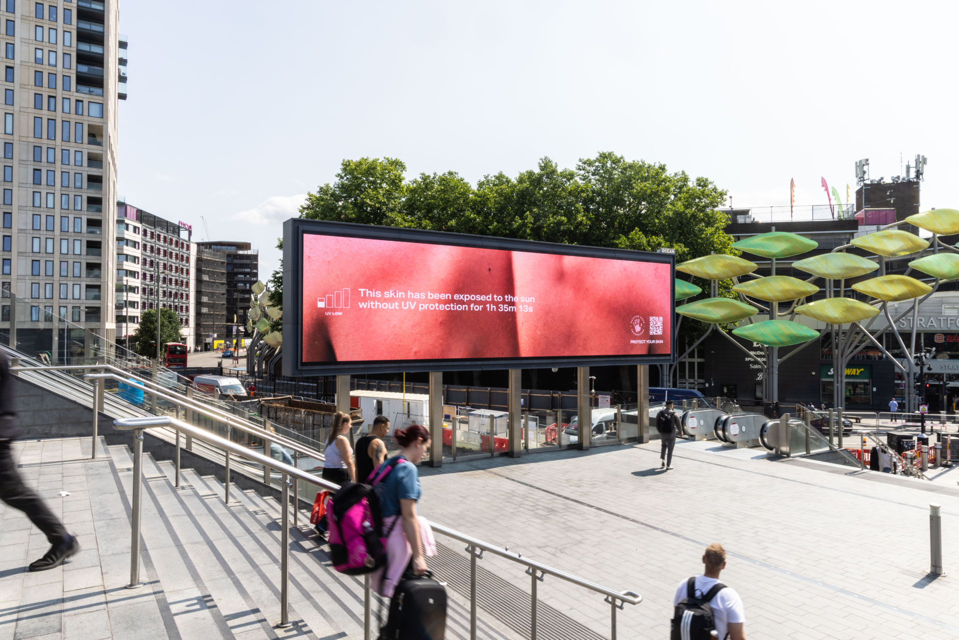 Las pantallas digitales mostraban inicialmente una piel sana. Pero cuando el índice UV aumentaba en tiempo real, la imagen comenzaba a quemarse, enrojecerse y ampollarse frente a los ojos del público.